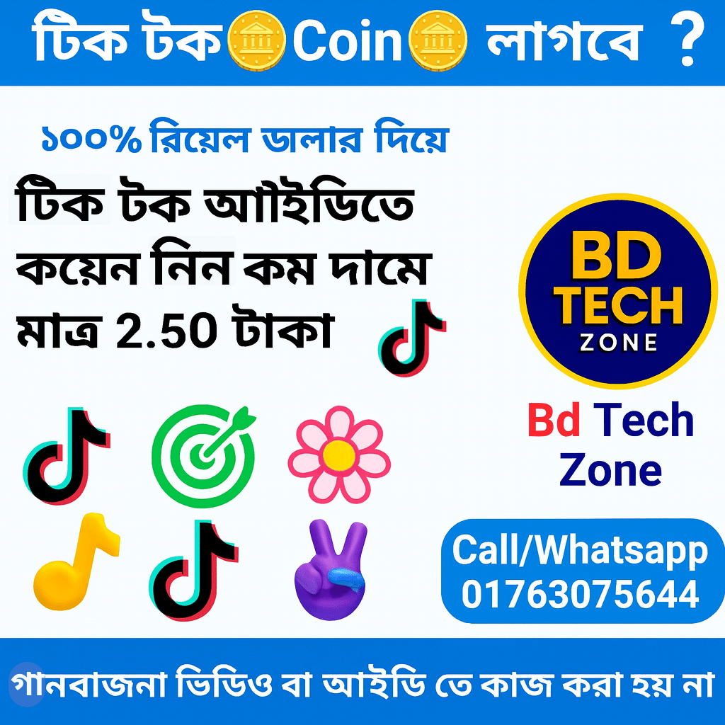 🎉 TikTok Coin কিনুন এখনই সবচেয়ে সহজ উপায়ে! Bd tech Zone থেকে সংগ্রহ করুন TikTok Coin এবং আপনার প্রিয় ক্রিয়েটরদের সাপোর্ট করুন বা নিজের ভিডিওতে এক্সট্রা ভিউ ও এনগেজমেন্ট পেতে আজই অর্ডার করুন।